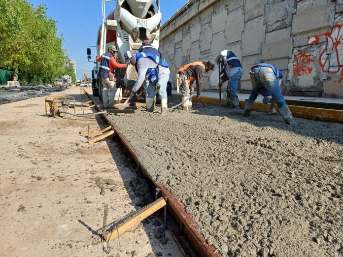 La Dirección de Obras Públicas informó que este lunes se llevó a cabo el colado de aproximadamente 48 metros cúbicos de concreto para la conformación de nuevas losas, garantizando una superficie de rodamiento más resistente y segura para miles de automovilistas que transitan diariamente por esta arteria.