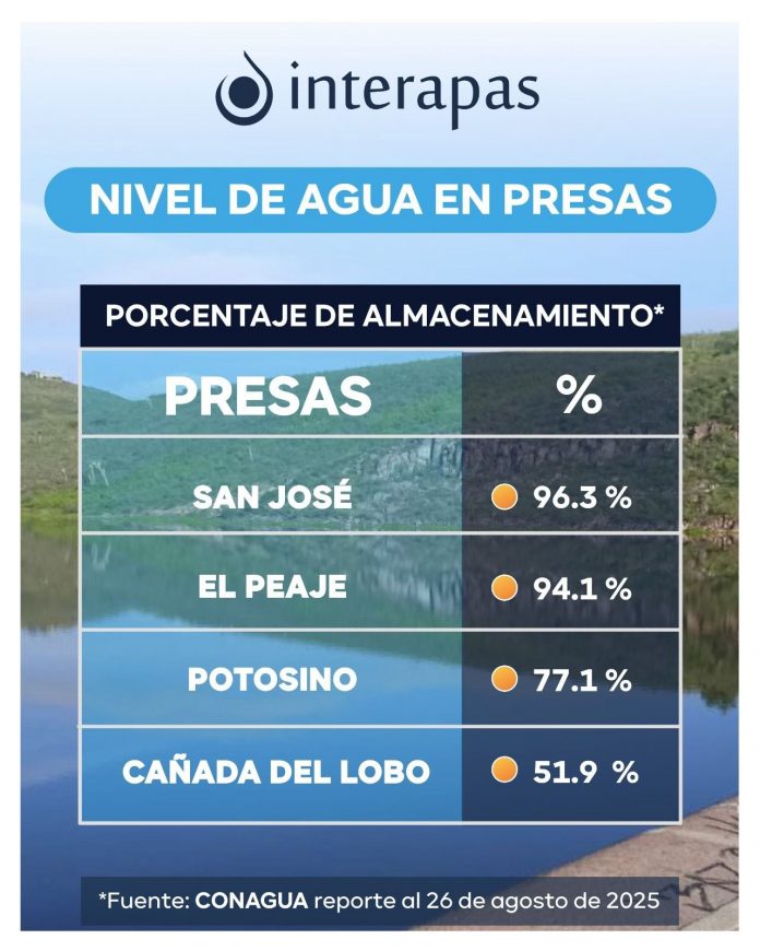 Según el más reciente reporte del INTERAPAS, la presa de San José está en un 96.3 %; El Peaje en un 94.1; El Potosino en un 77.1 y la Cañada del Lobo en un 51.9 por ciento, luego de las lluvias registradas durante estos días.