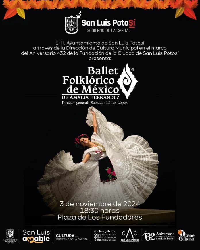 Para conmemorar el 432 Aniversario de la fundación de San Luis Potosí, el Ayuntamiento de la Capital ha organizado un evento cultural de primer nivel que tendrá lugar el próximo domingo 3 de noviembre en la Plaza de Fundadores, desde las 18:30 horas. La celebración contará con la destacada participación del Ballet Folklórico de México de Amalia Hernández, una de las agrupaciones de danza más reconocidas a nivel mundial por su interpretación del folklore mexicano.