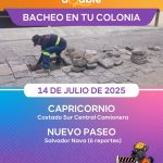 Este lunes 14 de julio se continúa con la atención a reportes que envía la ciudadanía, con 40 atenciones en las calles de: Rubén Darío en la colonia Valle Verde; Luis de Molina del fraccionamiento Tangamanga; Costa Rica, colonia Santuario; Antonio Villaseñor, en el tramo de Niño Artillero a Fray Antonio Vázquez Espinoza, colonia Universitaria; Estrella, de Granizo a Centella, en la colonia Garita de Jalisco; calle Costado Sur Central Camionera, entre Virgo y Géminis, colonia Capricornio; Salvador Nava, en el tramo de Vicente Rivera a Puente Pemex, Nuevo Paseo; Tenco, en el tramo de Puente de Ixtla a Gualiname, en la colonia Tercera Chica 2; Francia, de Italia a Roma, colonia Providencia; y las calles de Portal de Las Mercedes, y Haciendas de México, en la colonia Haciendas de México.