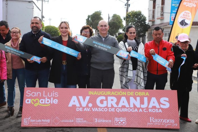 El Alcalde de San Luis Capital, Enrique Galindo Ceballos, inauguró la rehabilitación integral de la avenida Granjas, que conecta Vasco de Quiroga y avenida Morales-Saucito, una de las vialidades más extensas e importantes de la colonia Industrial Aviación. Se trata de una obra que por décadas fue demandada por vecinas y vecinos de la zona, a quienes dio otra noticia: pavimentará otra calle más: Fray J. de Juárez, que presenta un evidente deterioro.