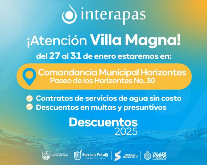 SLP.- La dirección general de Interapas invita a los habitantes del fraccionamiento Villa Magna a regularizarse con el organismo para contratar sus servicios de agua potable, alcantarillado y saneamiento, obteniendo 100 por ciento de descuentos en multas y presuntivos, además de que el contrato no tiene costo.