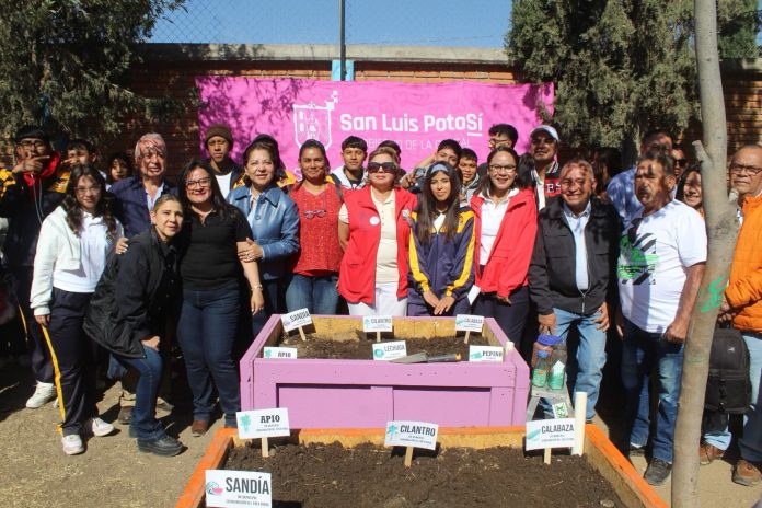 SLP.- La Presidenta del Sistema Municipal DIF, Estela Arriaga Márquez, felicitó a la comunidad educativa de la Preparatoria Municipal “Nueva Generación”, en la Delegación de La Pila, por continuar el fortalecimiento de su huerto al cambiar al sistema de cajones de auto riego por absorción.