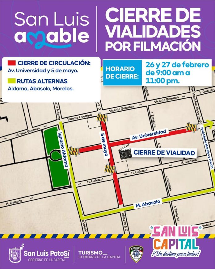 El Gobierno de la Capital recordó a las y los automovilistas que este miércoles 26 y jueves 27 de febrero, se realizarán filmaciones en el Centro Histórico de la Capital, por lo que habrá cierres de calles en esta zona de la ciudad.