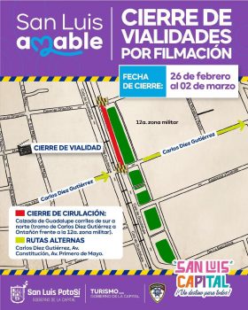 De igual manera, la autoridad municipal volvió a informar que a partir también del 26 de febrero y hasta el 2 de marzo, permanecerá cerrada la Calzada de Guadalupe en sus carriles de sur a norte en el tramo de Carlos Díez Gutiérrez a Ontañón, frente a la 12va Zona Militar, cuyas vías alternas son Carlos Díez Gutiérrez, Constitución y la calle 1 de Mayo.