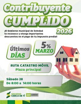 Con acciones que acercan los servicios básicos a donde la ciudadanía los necesita, el Ayuntamiento de Soledad de Graciano Sánchez, a través de la Dirección de Catastro, informa que a cinco días de concluir el programa de descuentos “Contribuyente Cumplido”, se ha alcanzado un 95 por ciento de la meta establecida, la cual es de 80 millones de pesos de recaudación por impuesto predial, lo cual refleja la confianza y la buena participación ciudadana con el Gobierno Municipal.