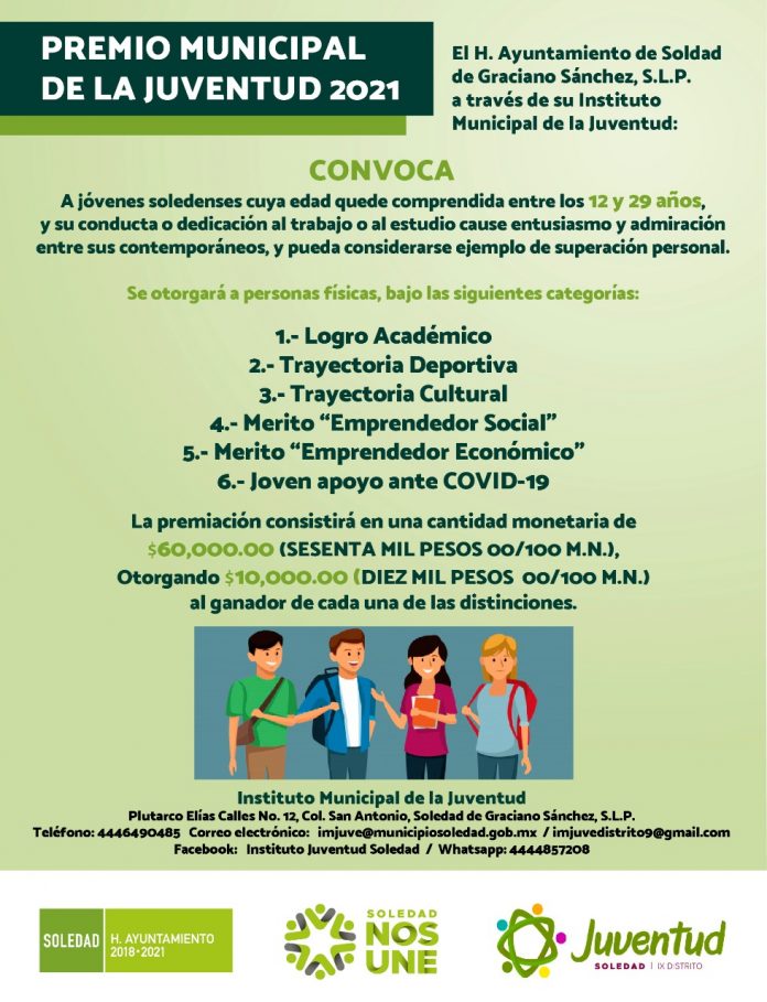 El Ayuntamiento de Soledad de Graciano Sánchez, informa que ya han sido elegidos los ganadores del Premio Municipal de la Juventud edición 2021, cuya convocatoria tuvo una nutrida participación en cuanto a perfiles postulados en las diversas categorías.