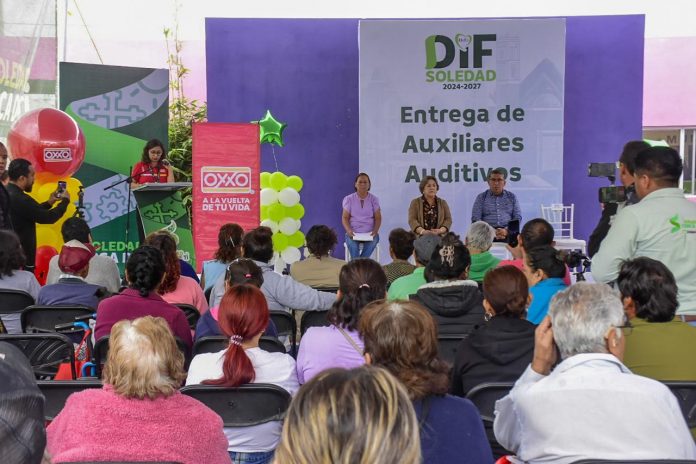 Juan Manuel Navarro Muñiz, Alcalde de Soledad de Graciano Sánchez, encabezó la ceremonia de entrega de 50 aparatos auditivos que fueron donados por la cadena comercial OXXO al Sistema Municipal para el Desarrollo Integral de la Familia (DIF), dispositivos que a partir de hoy transforman vidas de niños, niñas, jóvenes y adultos, mejorando su calidad de vida a través de políticas de inclusión e igualdad social; el evento, realizado en la Unidad Básica de Rehabilitación (UBR) número dos, reunió a familias soledenses que recibieron este apoyo que representa un cambio trascendental en su desarrollo personal y social.