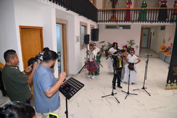 Con entusiasmo y alegría, el primer Coro Infantil de la Escuela Municipal de Música engalanó la inauguración del Altar de Muertos Monumental instalado en el interior de la Presidencia Municipal; las y los pequeños ataviados como catrines y catrinas, interpretaron con emotividad los temas “Recuérdame”, “Un Poco Loco” y “El Mundo es mi Familia”, conquistando al público presente con su talento y simpatía.