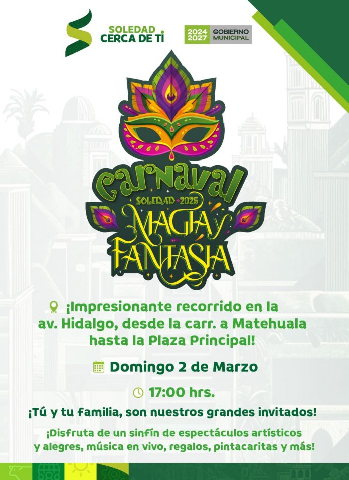 Soledad de Graciano Sánchez se prepara para recibir con entusiasmo el tradicional «Carnaval 2025», que se celebrará el domingo 2 de marzo, un evento que este año se distingue bajo el lema “Magia y Fantasía”, y promete ser una festividad llena de color, alegría y tradición, consolidándose como una de las celebraciones más importantes del municipio para el fomento de la integración social.