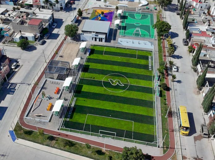 -El nuevo parque cuenta con cancha deportiva, trotapista, juegos infantiles con pasto sintético, iluminación led y un módulo de usos múltiples, beneficiando a niñas, niños, jóvenes y adultos mayores, así como con una Purificadora gratuita.