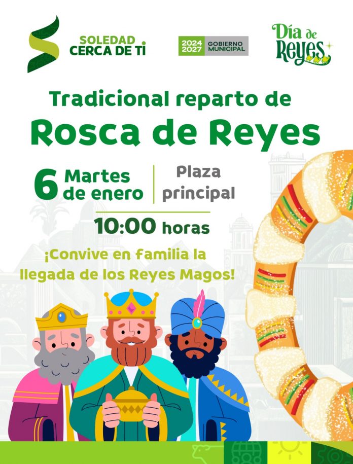 El Ayuntamiento de Soledad de Graciano Sánchez invita a las familias soledenses a compartir una mañana especial, este martes 6 de enero, durante la tradicional Partida de Rosca de Reyes, que se realizará en la Plaza principal a partir de las 10:00 horas.
