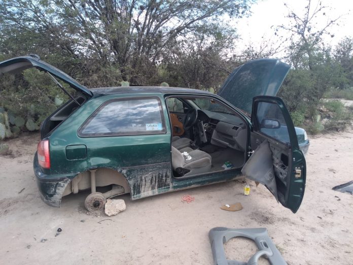 En recorridos de prevención y vigilancia, se visualiza en un camino de terracería perteneciente a Rancho Nuevo próximo camino al Aeropuerto, un automóvil compacto con claras huellas de haber sido desvalijado.