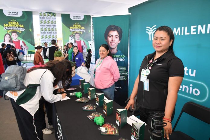 Con gran entusiasmo de jóvenes de distintos puntos del municipio, este jueves se llevó a cabo la Feria Municipal de Universidades en la explanada del Teatro y Centro Cultural «Doroteo Arango», impulsada por el Ayuntamiento de Soledad de Graciano Sánchez, que busca acercar oportunidades educativas y apoyar la formación académica de la población, refrendando el compromiso del Alcalde Juan Manuel Navarro Muñiz de estar cerca de las y los jóvenes y de garantizar que tengan acceso a información y beneficios que les permitan continuar sus estudios.