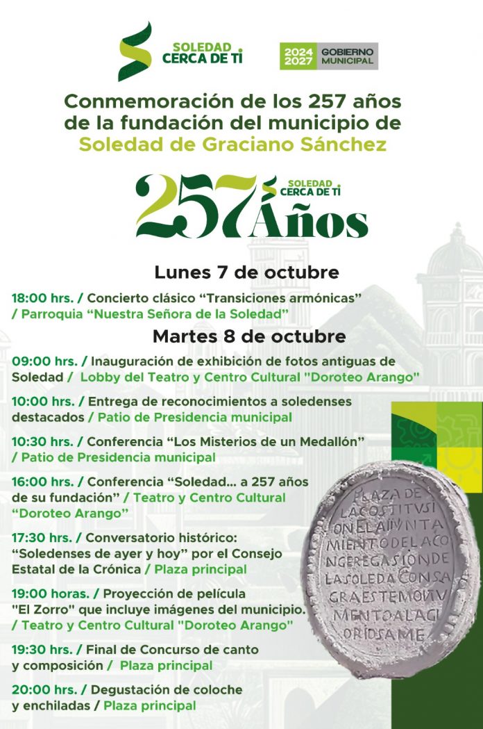 A las 4:00 de la tarde, el Teatro Doroteo Arango será sede de la conferencia “Soledad… a 257 años de su fundación”, donde se hará un análisis histórico del municipio; más tarde se proyectará la película “La Leyenda del Zorro” grabada en este municipio. A las 5:30 de la tarde, en la Plaza principal, se llevará a cabo el Conversatorio Histórico “Soledenses de ayer y hoy”, en el que cronistas adjuntos de distintos municipios ofrecerán una charla sobre el recuento histórico de Soledad de Graciano Sánchez, su patrimonio cultural y los personajes que han marcado su evolución a lo largo de los años.