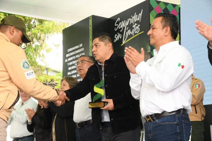 En el marco de la ceremonia que reconoció a oficiales de la Guardia Civil Municipal de Soledad de Graciano Sánchez, por mérito policial en sus funciones como servidores públicos, el Gobernador del Estado, Ricardo Gallardo Cardona, y el Alcalde Juan Manuel Navarro Muñiz, formalizaron el aumento salarial a la totalidad de agentes de la corporación de hasta un 40 por ciento, lo que genera condiciones y trato digno a quienes diariamente salen a arriesgar su vida para mantener la paz social.