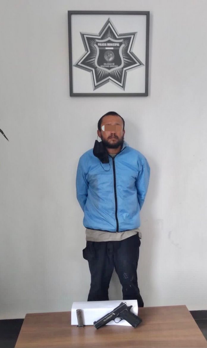 llevaron a cabo la detención de un masculino que fue sorprendido en posesión de un arma de gas tipo réplica y un cargador abastecido calibre 380 mm.