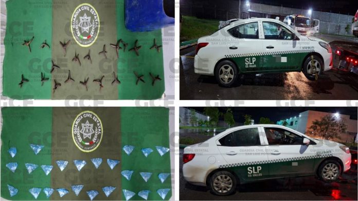 Los detenidos, Javier “N” de 24 años y Josué “N” de 21 años, fueron ubicados en la colonia Tipzen en el municipio de Ciudad Valles, asegurándoles 25 dosis de “cristal” y 20 artefactos metálicos conocidos como “poncha llantas”, además de dos vehículos del servicio público.